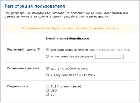 Для начала работы с платёжной системой Вы должны пройти простую регистрацию, указав e-mail и пароль для доступа к своей учётной записи. Также обязательно подтвердите свой электронный почтовый адрес по специальной ссылке, которую Вам отправят на e-mail для активации учётной записи.